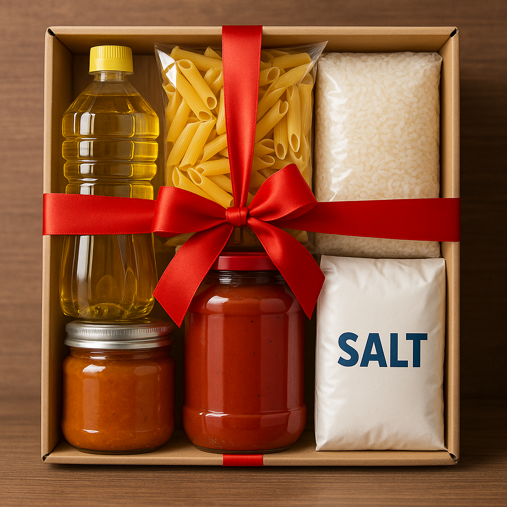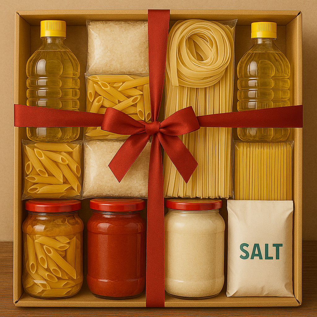 5 أرز أبيض معبأ 1 كجم- 3 مكرونة مقصوصة 350 جم - 2 مكرونة أقلام 350 جم - 1 مكرونة سباجيتي 350 جم - 2 شعرية 350 جم - 1 لسان عصفور 350 جم - 1 صلصة 300 جم - 4 زيت قلي 800 مل - 5 سكر معبأ 1 كجم - 2 عدس أصفر 500 جم - 3 ملح كيس - 1 خل 1 لتر - 2 دقيق فاخر 1 كجم - 1 زيت كريستال ذرة جم 800 - 1 زيت كريستال عباد جم 700